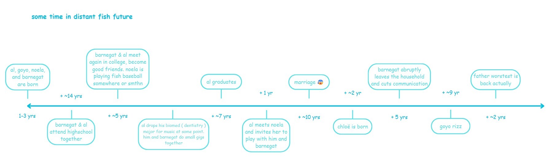 the eponymous separation that earned barnegat the mystical magical title of "guy from divorce" was his own fault 😀 i feel this needed its own section for explanation but my rundown is that he was asked if he was cool with being a father and he said yes. but then when chloë was born he was like wait a hot minute ...... that means i have an extremely important new list of responsibilities but im not the guy from fatherhood im the guy from famous fish jazz band Nettle. so he tried to do both "perfectly" at the same time but that's not possible so he got scared and ran away when she was 5